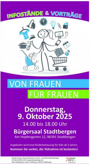 Die Frauenmesse „Von Frauen für Frauen“ in Stadtbergen findet am Donnerstag, den 9. Oktober 2025, von 14:00 bis 18:00 Uhr im Bürgersaal Stadtbergen, Am Hopfengarten 12 statt. Die Veranstaltung, die von der Stadt Stadtbergen veranstaltet wird, bietet Informationen und Beratungen rund um Themen wie Beruf, Familie, Ausbildung, Gesundheit und Wohnen, mit einem Fokus auf die Stärkung von Frauen in verschiedenen Lebenslagen.