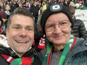 Und mitten im Block N, auf der Ulrich-Biesinger-Tribüne, steht er plötzlich neben mir: Florian Freund. Nicht im warmen VIP-Bereich, nicht abgeschirmt, sondern dort, wo die eingefleischten Fans stehen, singen und ihre Mannschaft mit Choreografien und Gesängen nach vorne peitschen. Mütze gegen die Kälte, dicker Mantel, freundliches Lächeln.