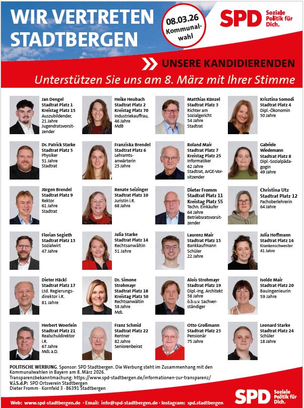 Wir als SPD Stadtbergen sind überzeugt: Persönlichkeiten machen Politik. Deshalb haben wir auf allen 24 Listenplätzen engagierte Menschen versammelt, die in den vergangenen Jahren Verantwortung für unsere Gesellschaft übernommen haben – in Vereinen, im Ehrenamt, im Beruf und im Stadtrat.