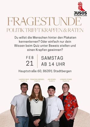 Am Samstag, 21. Februar, ab 14 Uhr in der Hauptstraße 60 in Stadtbergen (Leitershofen) gibt es die Gelegenheit, die Menschen hinter den Wahlplakaten kennenzulernen, direkt Fragen zu stellen und miteinander ins Gespräch zu kommen.