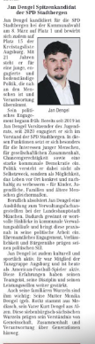 Der Beitrag würdigt besonders Jans Einsatz als Vorsitzender des Stadtberger Jugendrats. Gemeinsam mit seinem Team hat er in den vergangenen Jahren wichtige Impulse und konkrete Innovationen für junge Menschen vor Ort angestoßen. Genau dieses Engagement und diese Verantwortung für die Kommune waren für uns ausschlaggebend, ihn auf Listenplatz 1 der SPD-Liste zu setzen.